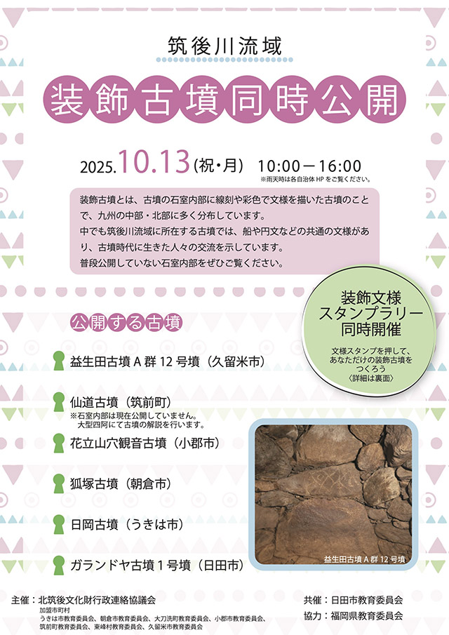 ○日時:令和7年10月13日(祝月)10時00分〜16時00分 装飾古墳とは、古墳の石室内部に線刻や彩色で文様を描いた古墳のことで、九州の中部・北部に多く分布しています。 中でも筑後川流域に所在する古墳では、船や円文などの共通の文様があり、古墳時代に生きた人々の交流を示しています。 普段公開していない石室内部をぜひご覧ください。 |
